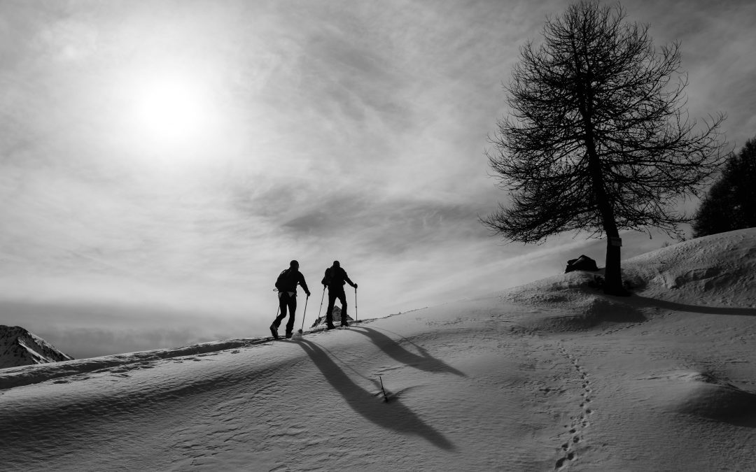 Il sole invernale di metà mattina, offuscato da nuvole leggere, proietta sul manto nevoso le lunghe ombre silenti che accompagnano gli scialpinisti durante la lunga salita.
