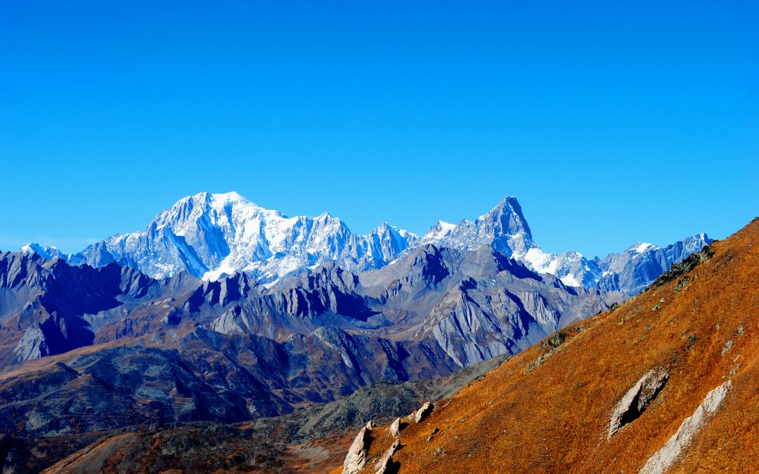 In una giornata autunnale di rara bellezza, attraverso la valle della Coumba Freida, spicca in tutta la sua maestosità il Monte Bianco.