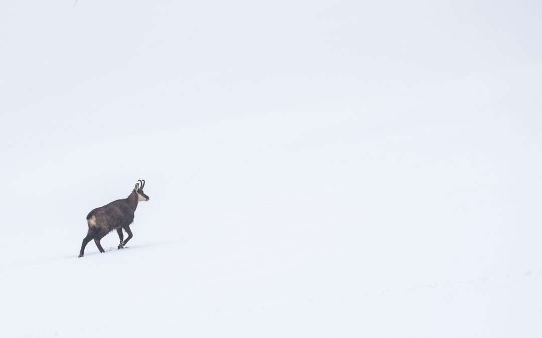 Il lungo inverno Il camoscio che attraversa il pendio innevato come metafora dell’uomo che supera i propri limiti.