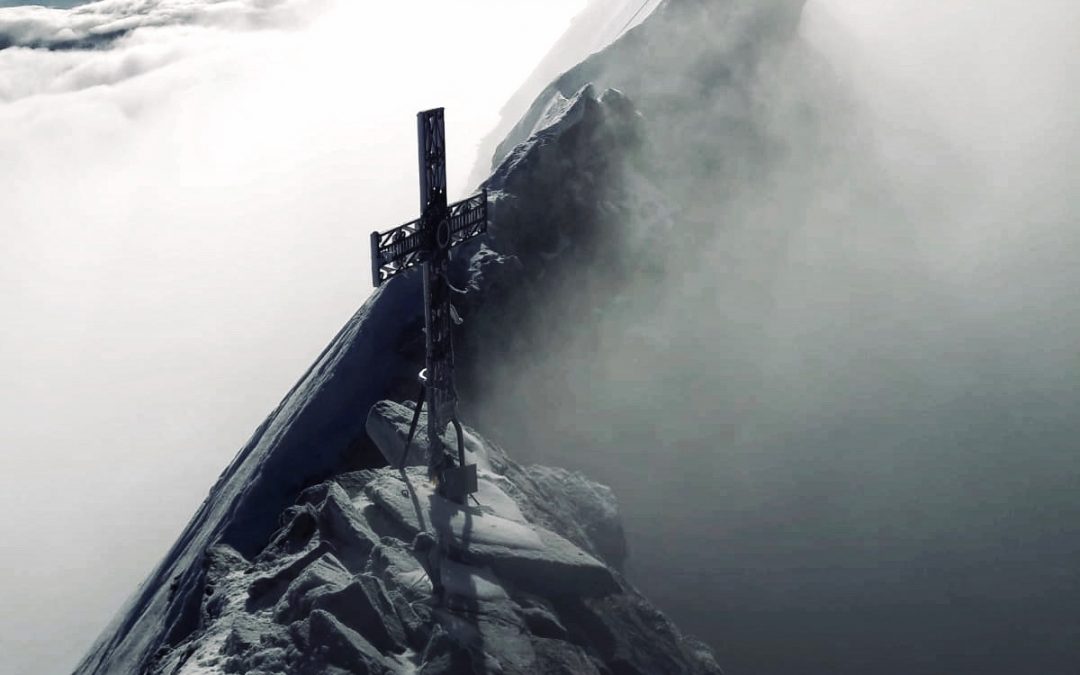 Vista della croce in cima al Cervino illuminata da un effimero raggio di sole.