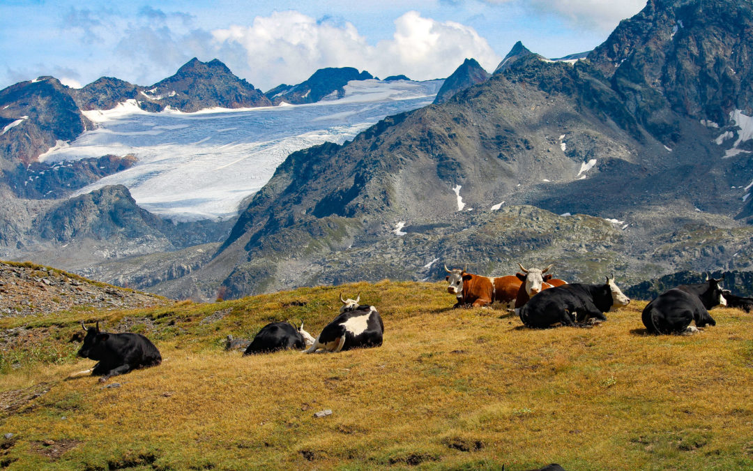 Mucche ai piedi del Rutor Mucche fotografate mentre pascolavano sotto la maestosità del ghiacciaio del Rutor
