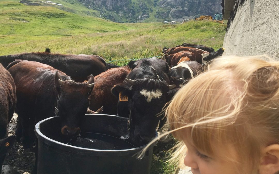 Giornata in famiglia a spasso nella vallata di La Thuile, a trovare un amico nel suo alpeggio. Océane, la mia bimbetta, tra i vitellini curiosi.