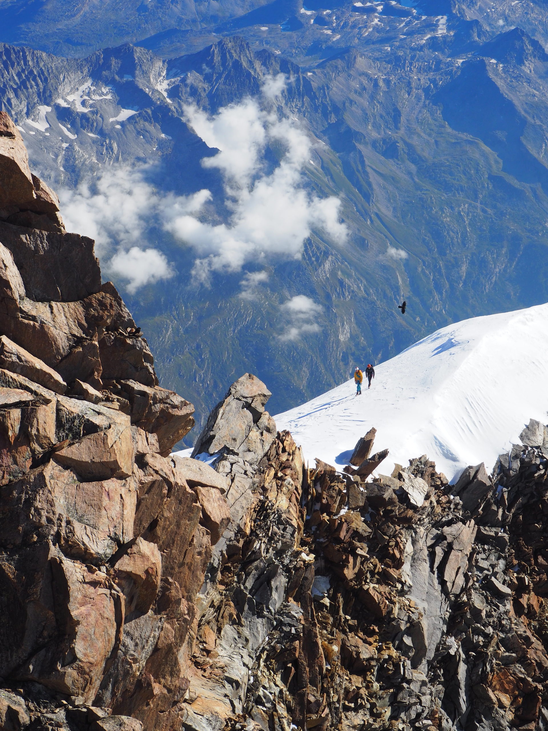Foto che rappresenta la parte finale di un’avventura per due amici, “accompagnati” da un rapace, che sono sul segmento finale della Cresta Signal su Monte Rosa.