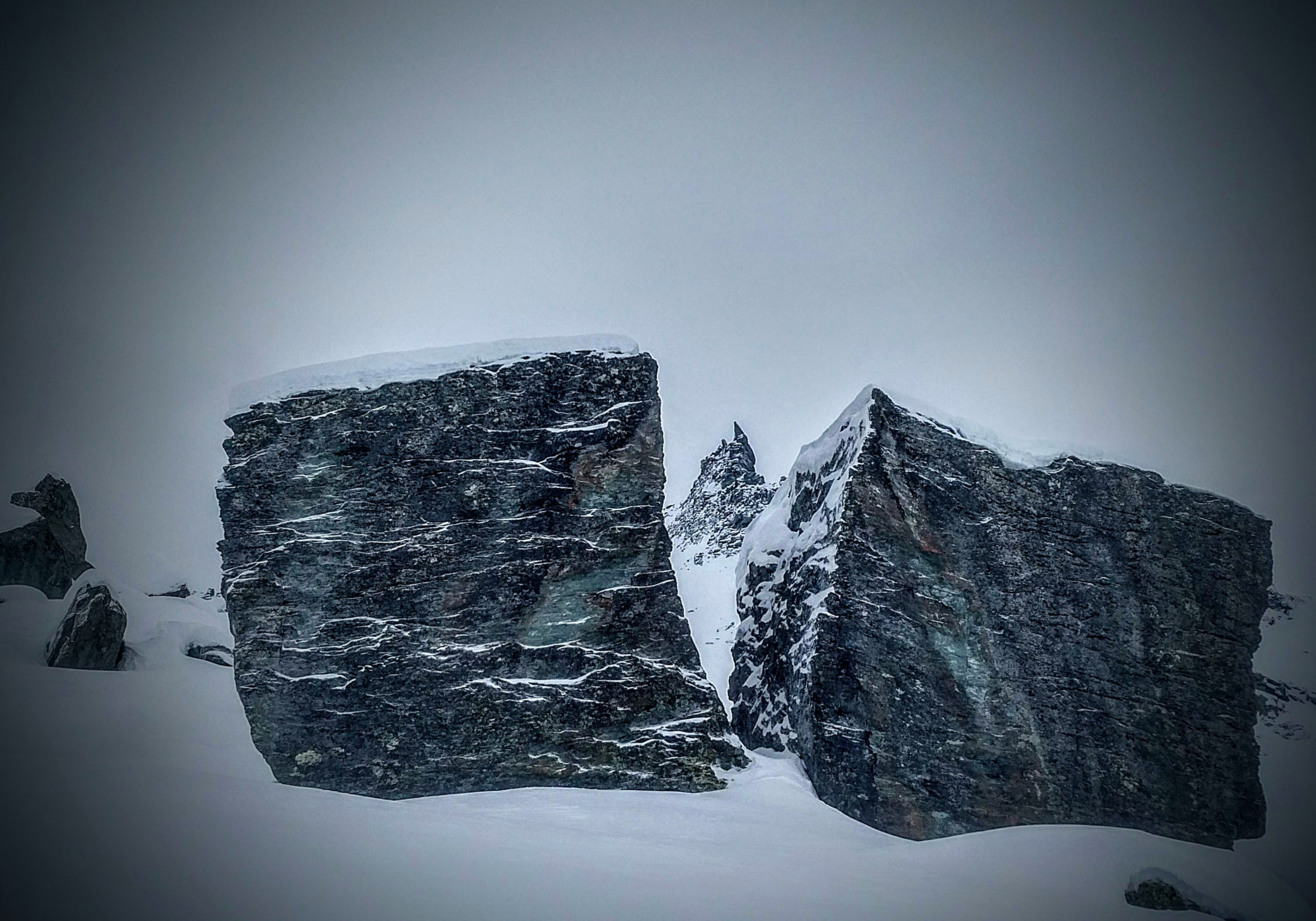 Giornata uggiosa di sci alpinismo e, nella foschia, appare un sasso spaccato di netto spalancato sull’ardito Bec Forcu, nella luce piatta e fredda della mattina. La meraviglia di una scoperta tra sassi uguali visti mille volte
