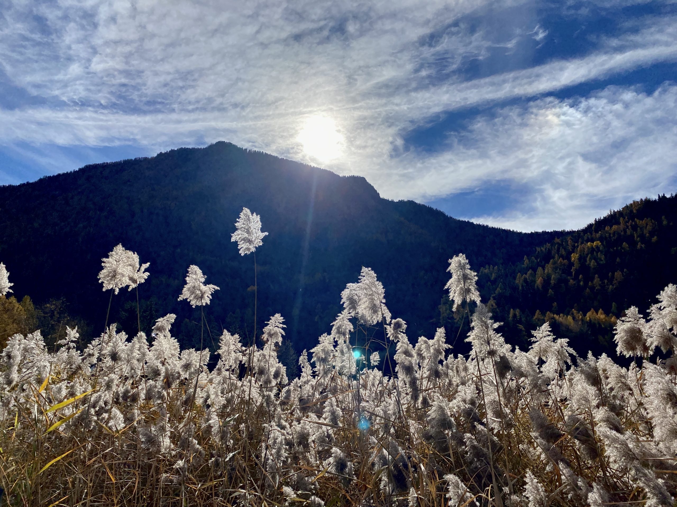 Una foto controluce dei ‘piumini’ al lago di Brusson