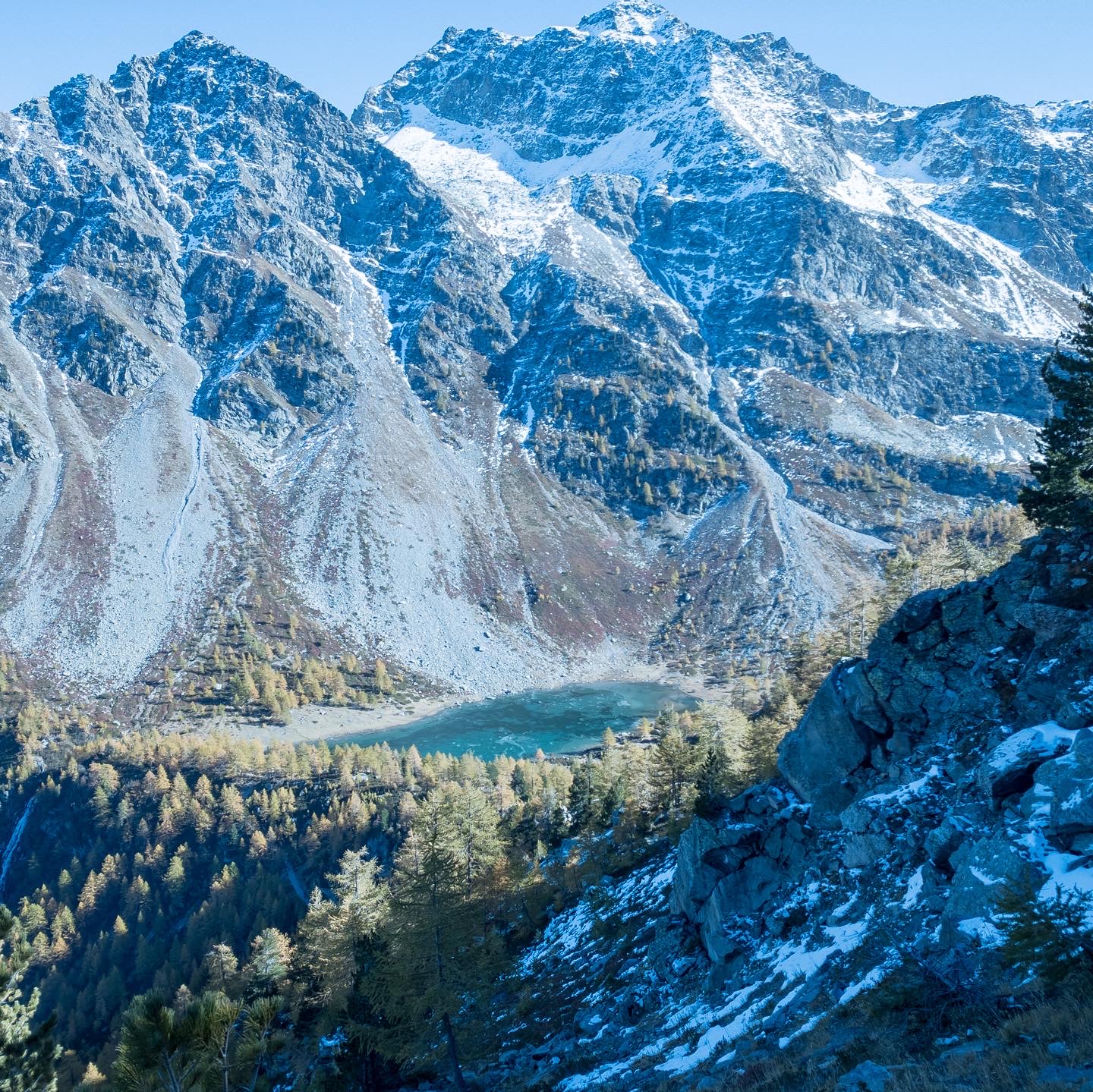 In lontananza il Lago d’Arpy incastonato tra le montagne , foto scattata dal sentiero per Punta Croce.