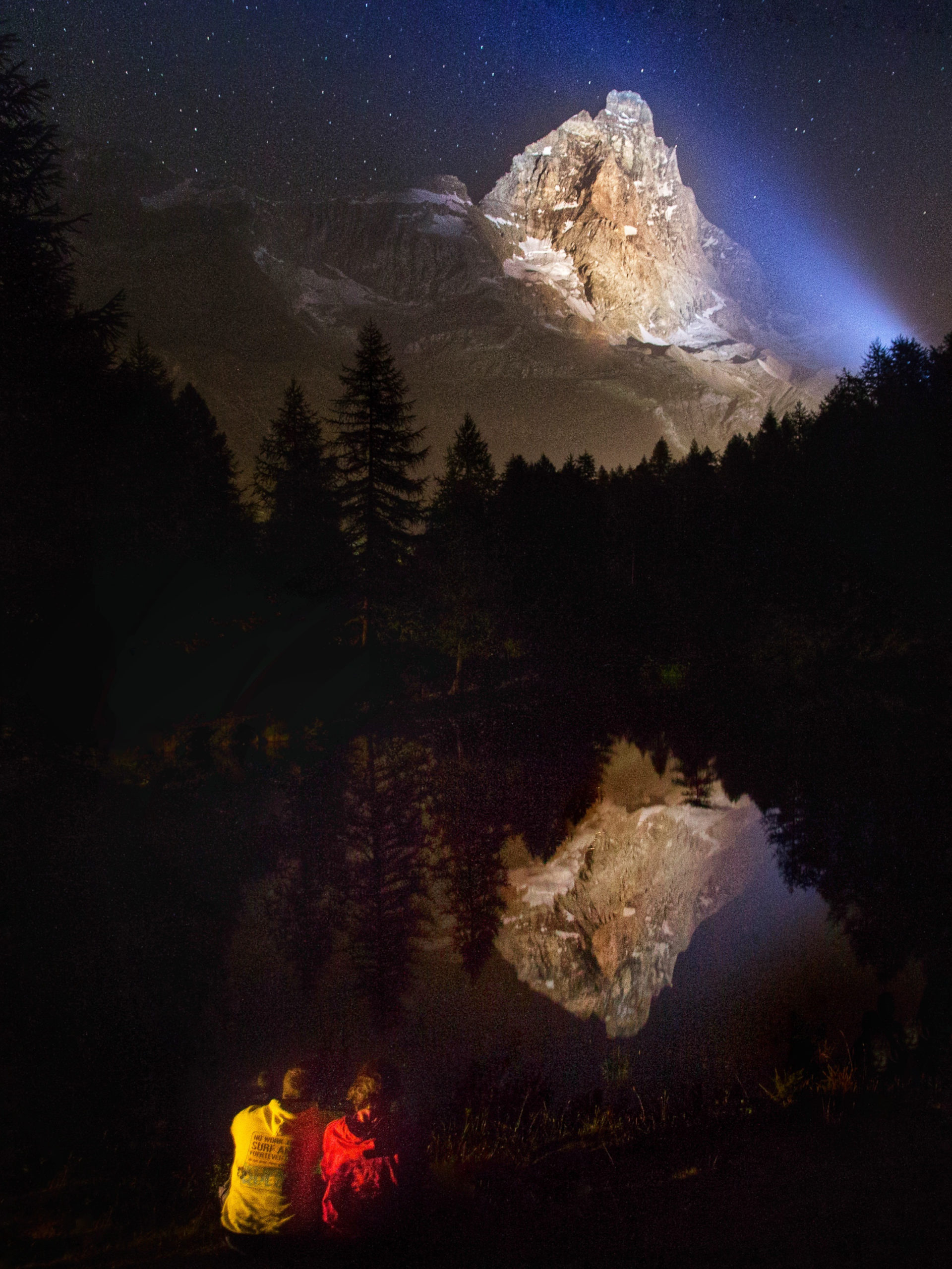 Omaggio alla Gran Becca Cervino illuminato per festeggiare i 150 anni dalla prima ascensione Davide VerthuyValtournenche, Cervinia, Lago Blu