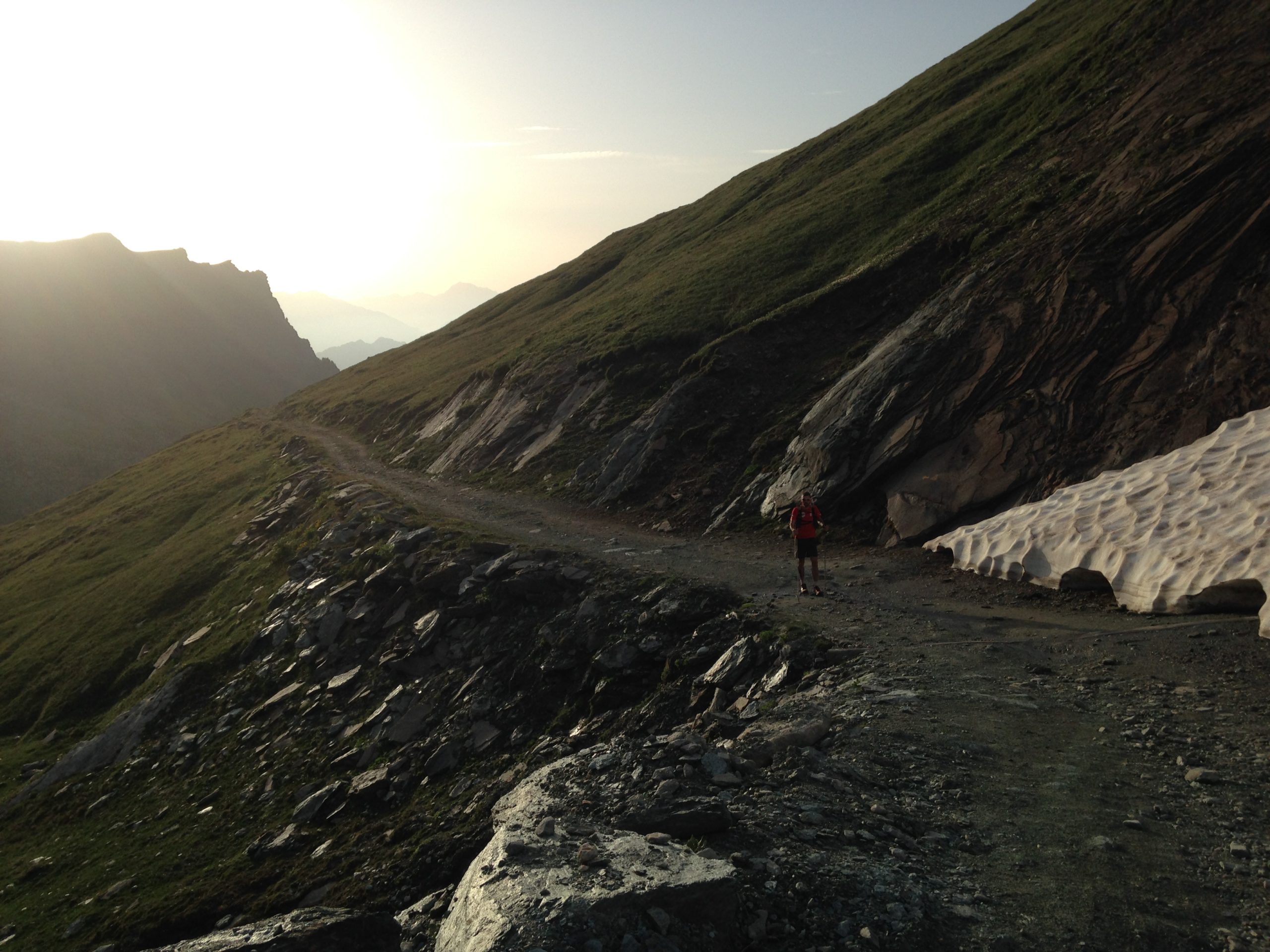 Una mattina presto, sull’Alta Via. Quell’estate, io e mio marito preparavamo il Tor des Geants e avevamo fatto un allenamento in notturna. Lo scatto è mio e lo ritrae mentre mi raggiunge.