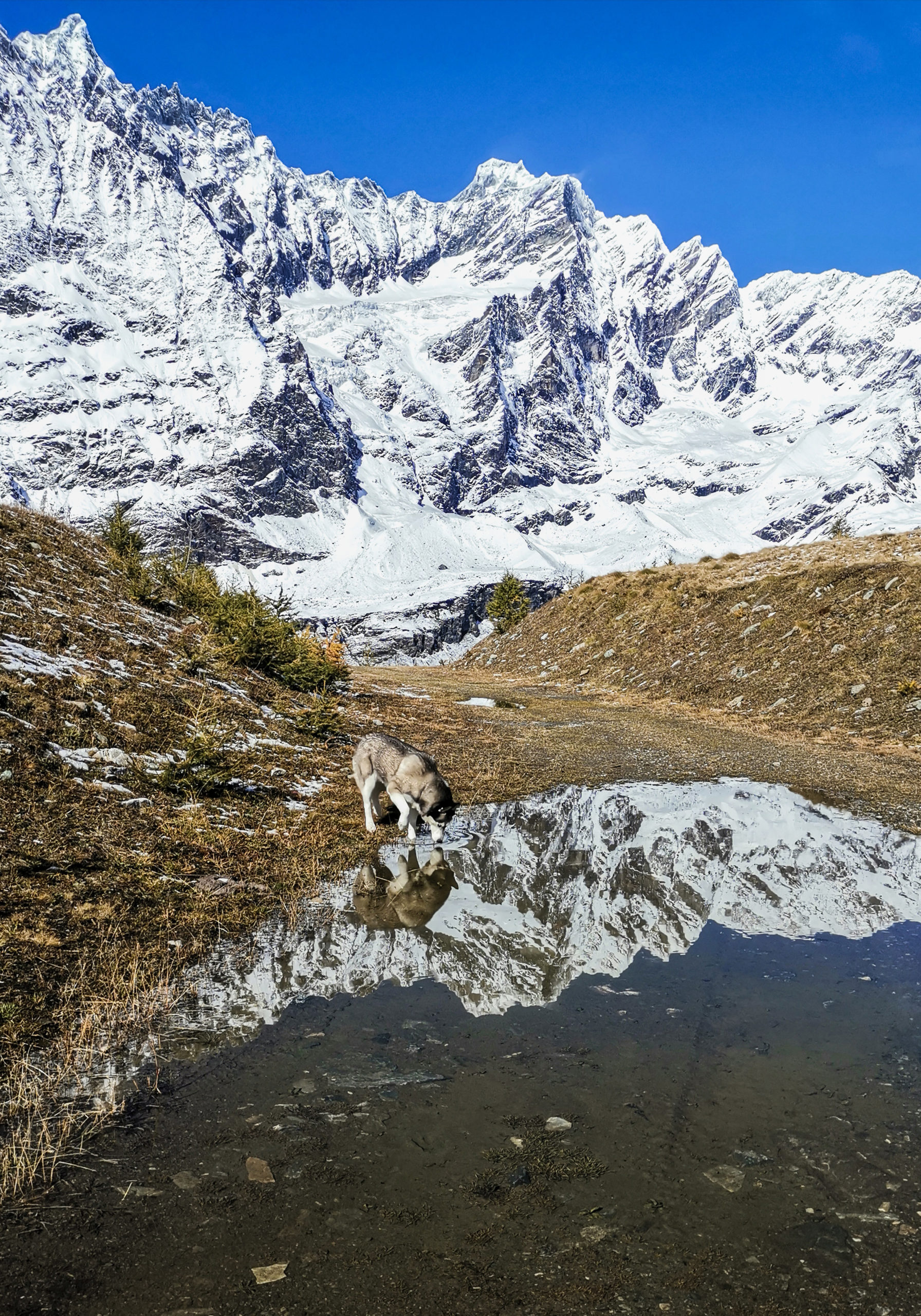 L’imponenza delle Grandes Murailles imbiancate dalla prima neve autunnale, riflessa in una pozza d’acqua che attira la curiosità e la sete di Ashley