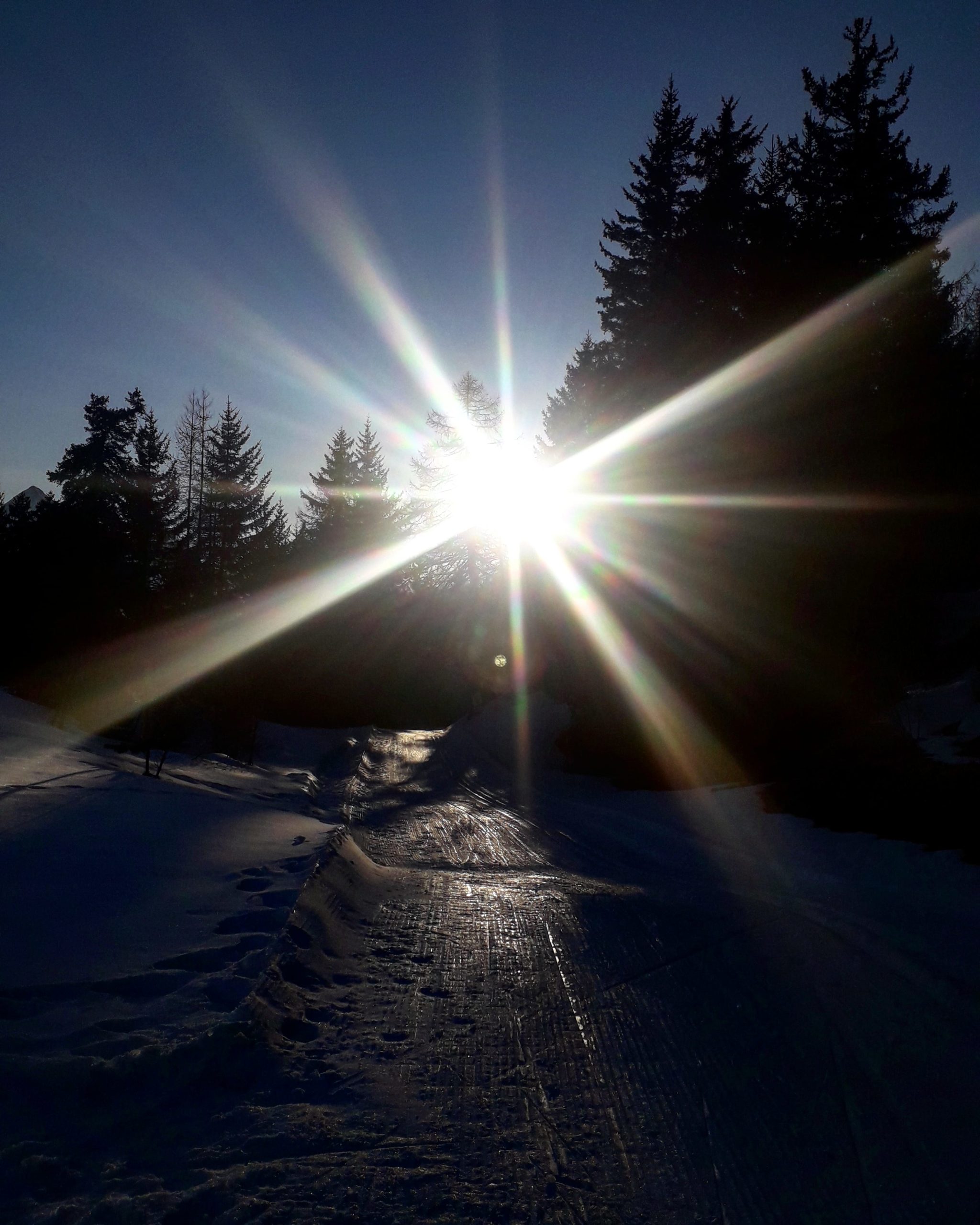uAl ritorno da una camminata con i ramponcini, l’ultimo raggio di sole di una splendida giornata.