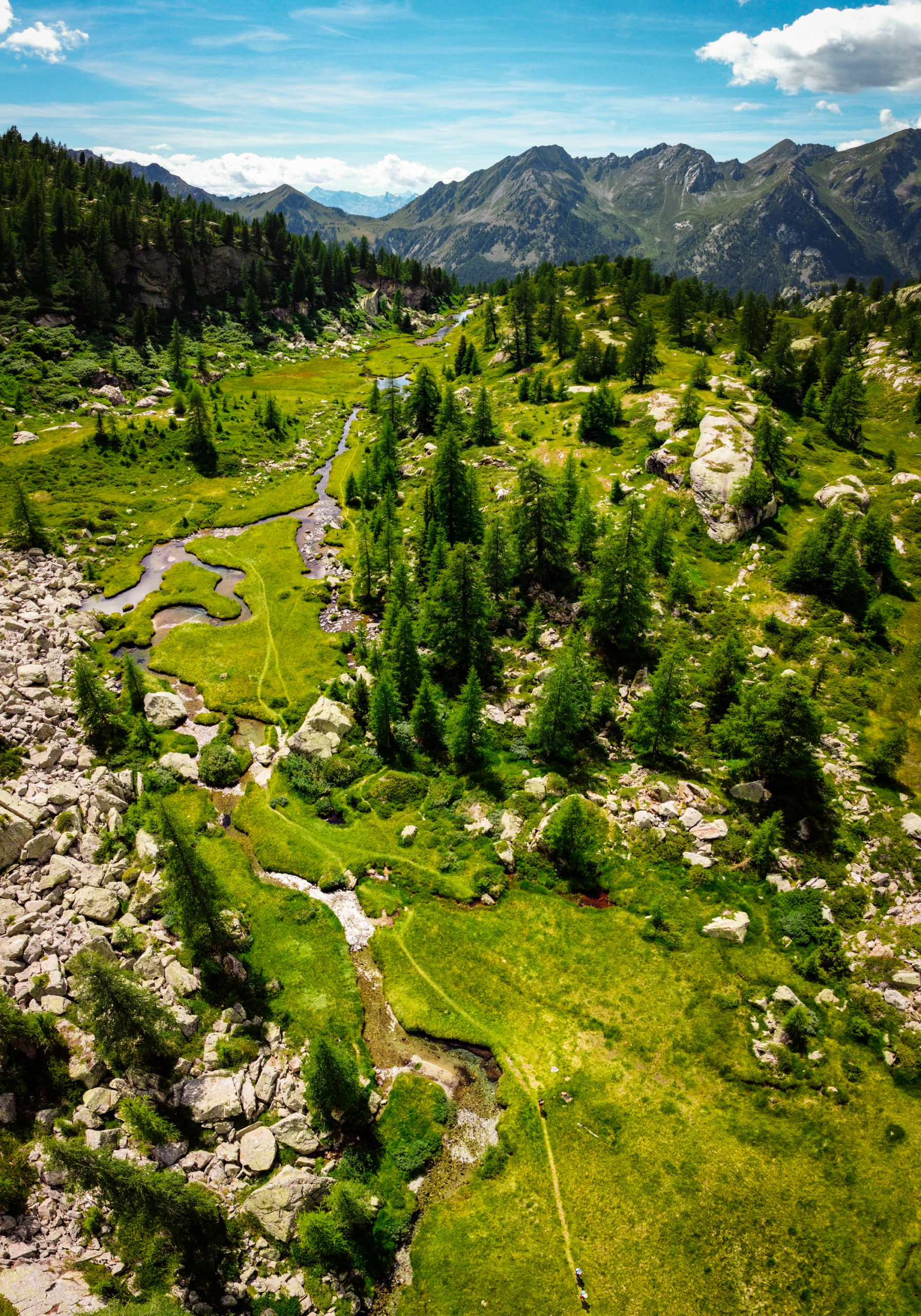La foto ritrae una panoramica aerea verticale, realizzata con il drone, della Valle dei Principi. Questa valle è situtata sopra al paese di Gressoney-Saint-Jean, sulla sinistra orografica del torrente Lys, a una quota di circa 2.200 m. La foto è stata scattata alla fine di Luglio 2020.