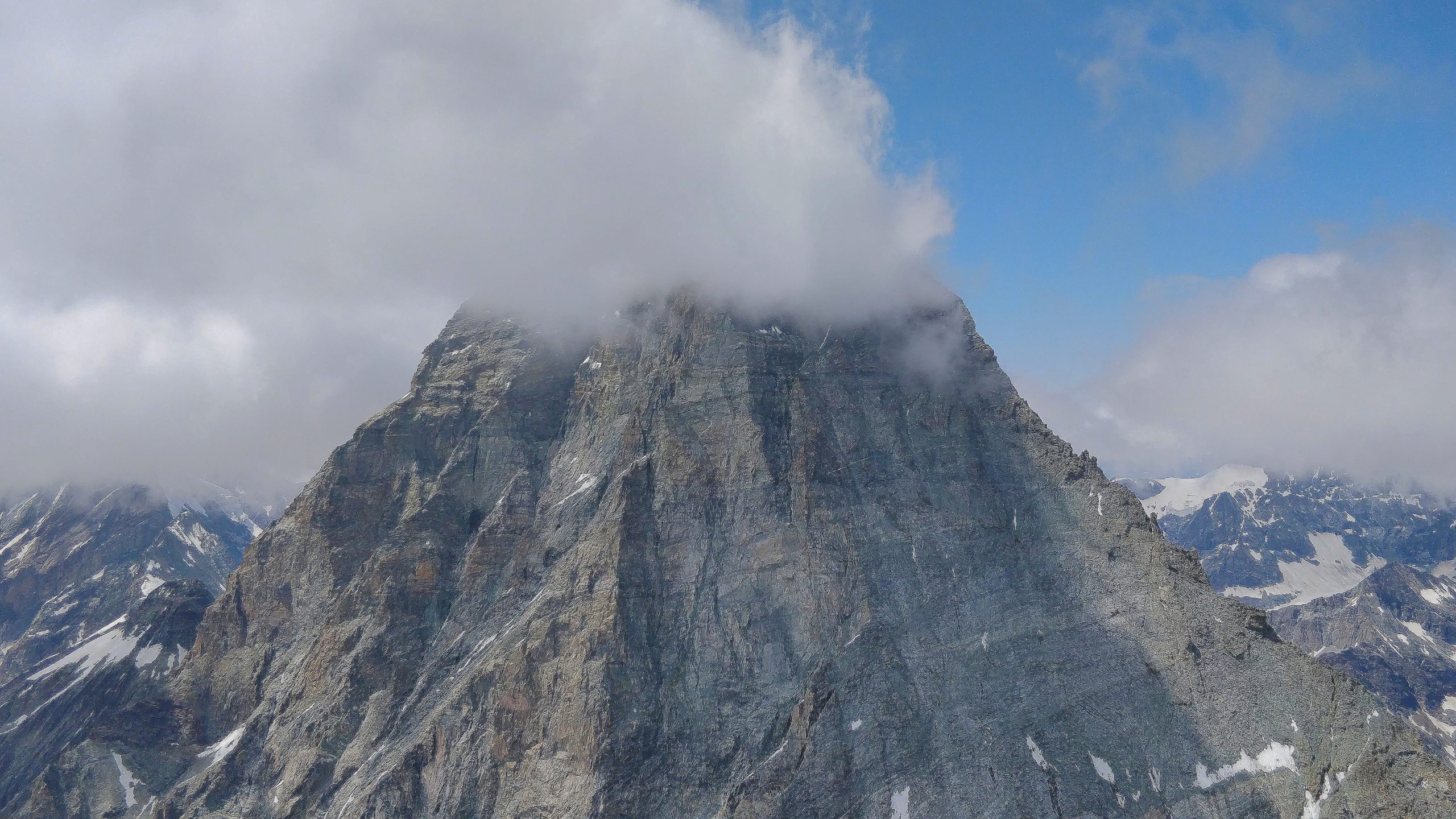 In una bella e calda giornata estiva, il forte vento da nord ha spinto una nuvola intorno alla Gran Becca, creando così l’apparenza di una montagna che fuma come l’Etna