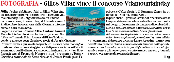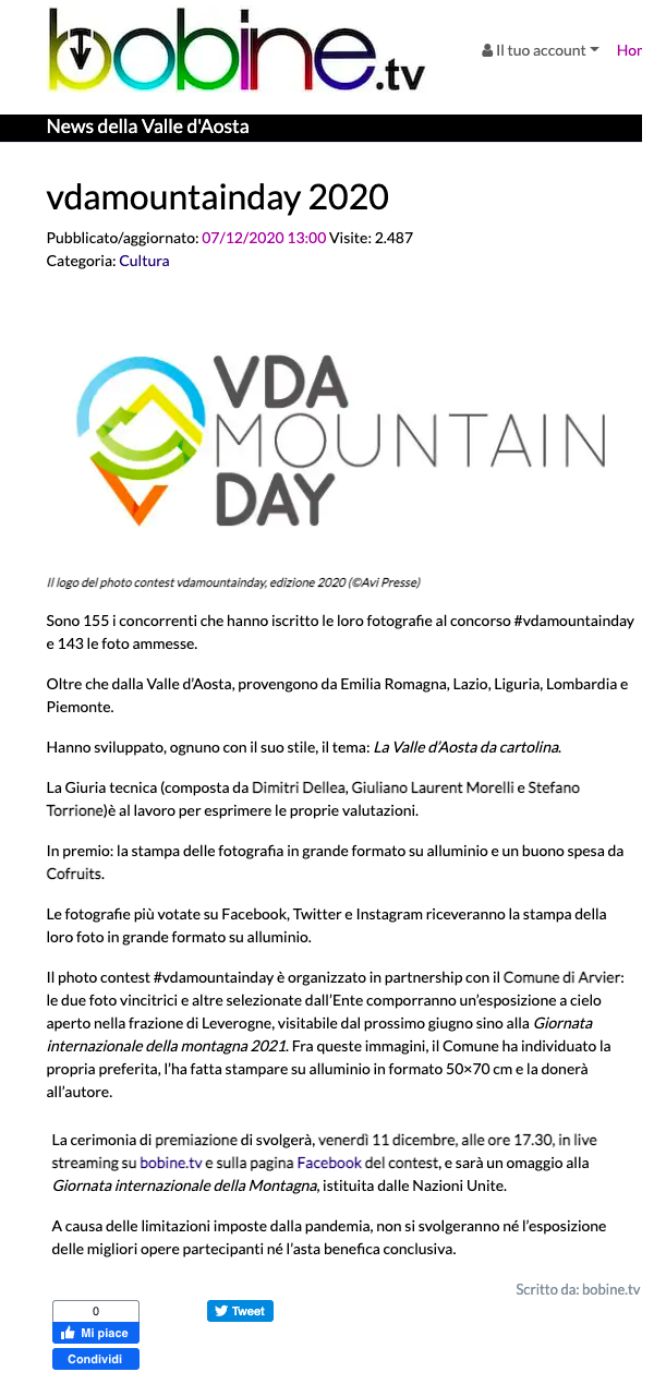 RASSEGNA STAMPA La Stampa 15 Dic 2020 | 2020 - Rassegna stampa Gazzetta Matin 14 Dic 2020 | 2020 - Rassegna stampa La Vallée Notizie 14 Dic 2020 | 2020 - Rassegna stampa Bobine 14 Dic 2020 | 2020 - Rassegna stampa AostaCronaca 9 Dic 2020 | 2020 - Rassegna stampa Crunchbase 9 Dic 2020 | 2020 - Rassegna stampa Bobine.tv 9 Dic 2020 | 2020 - Rassegna stampa Caratteremediterraneo.it 20 Nov 2020 | 2020 - Rassegna stampa Bobine.tv 17 Nov 2020 | 2020 - Rassegna stampa Parte l’edizione 2020 del photo contest vdamountainday 15 Nov 2020 | 2020 - Rassegna stampa Radio Proposta in Blu – Podcast 12/11/2020 Prima parte Radio Proposta in Blu – Podcast 12/11/2020 Seconda parte MEDIA PARTNER PARTNER SPONSOR PARTNER MEDIA PARTNER SPONSOR MEDIA PARTNER